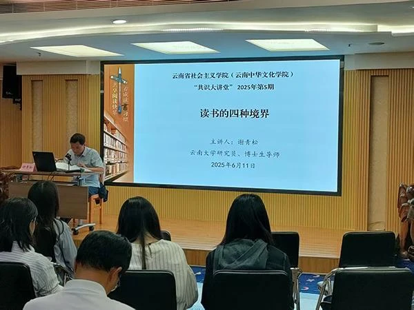 为加强书香社院建设,在学院营造浓厚的爱读书、读好书、善读书的良好氛围,6月11日,云南省社会主义学院(云南中华文化学院)举办2025年第5期“共识大讲堂”。本期讲堂以“读书的四种境界——中国古人的读书理念、方法及境界”为主题,邀请云南大学研究员、博士生导师,云南省国学研究会会长谢青松担任主讲嘉宾。
