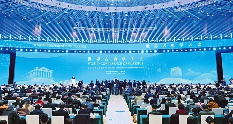 文明因交流而多彩、因互鉴而丰富。2024年11月7日,习近平总书记向首届世界古典学大会致贺信,表达了对各国专家学者担负起古典学研究的使命,促进文明传承发展、推动文明交流互鉴的殷切期望,为赓续历史文脉、加强文明对话、推动人类文明发展进步提供了重要指引。图为当日首届世界古典学大会开幕式在北京雁栖湖国际会展中心举行。新华社记者 李贺/摄
