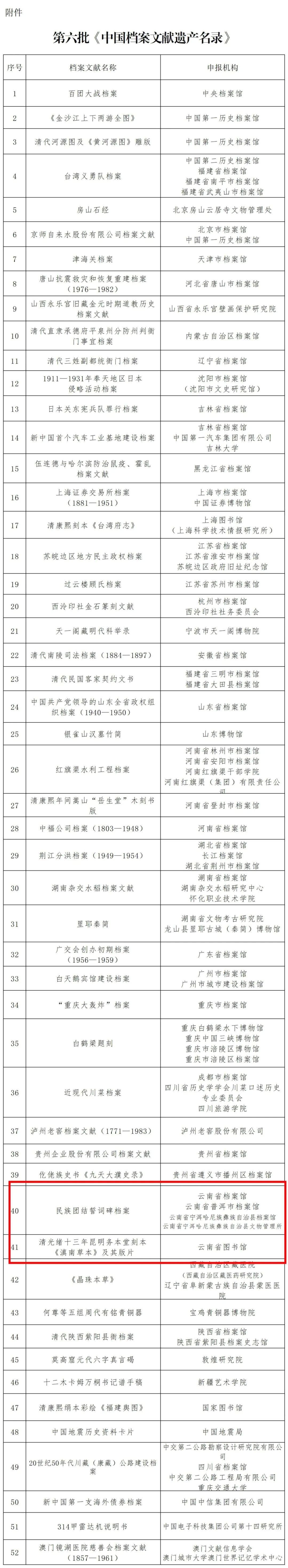 6月9日是第18个“6·9国际档案日”,国家档案局发布了第六批《中国档案文献遗产名录》,全国共有52项档案文献入选。其中,云南申报的《民族团结誓词碑档案》《清光绪十三年昆明务本堂刻本<滇南草本>及其版片》入选。