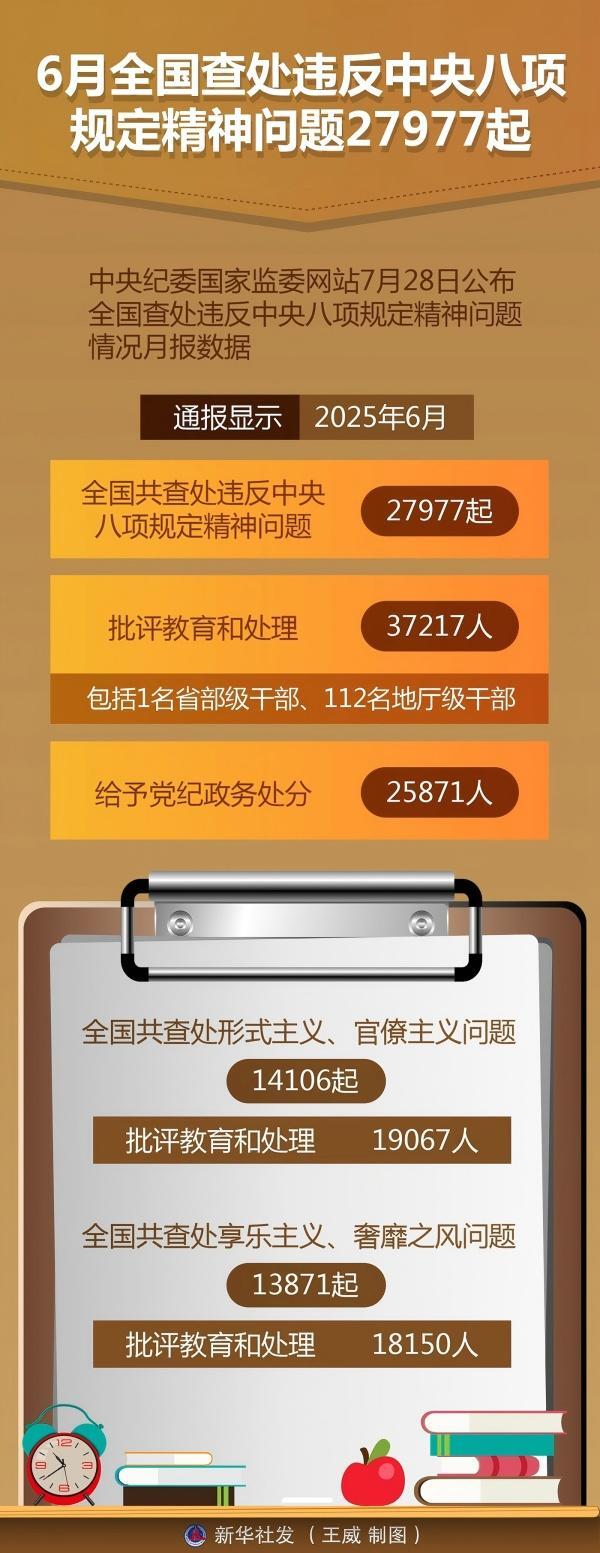 中央纪委国家监委网站28日公布全国查处违反中央八项规定精神问题情况月报数据。通报显示,今年6月,全国共查处违反中央八项规定精神问题27977起,批评教育和处理37217人(包括1名省部级干部、112名地厅级干部),给予党纪政务处分25871人。