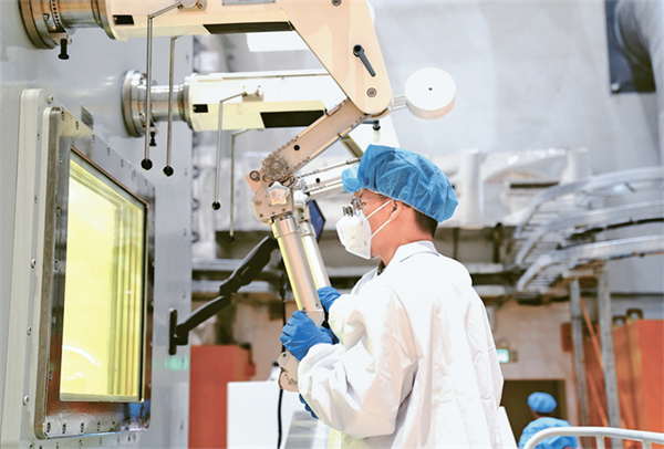 2025年,位于甘肃民勤的2兆瓦液态燃料钍基熔盐实验堆已成功实现国际首次钍铀核燃料转换,成为目前国际上唯一运行且实现钍燃料入堆的熔盐堆,为我国未来规模化开发利用钍资源、发展第四代先进核能系统提供核心技术支撑与可行方案。图为2025年10月24日,在中国科学院上海应用物理研究所武威园区,科研人员在2兆瓦液态燃料钍基熔盐实验堆加料—取样热室工作。 新华社记者 张建松 摄