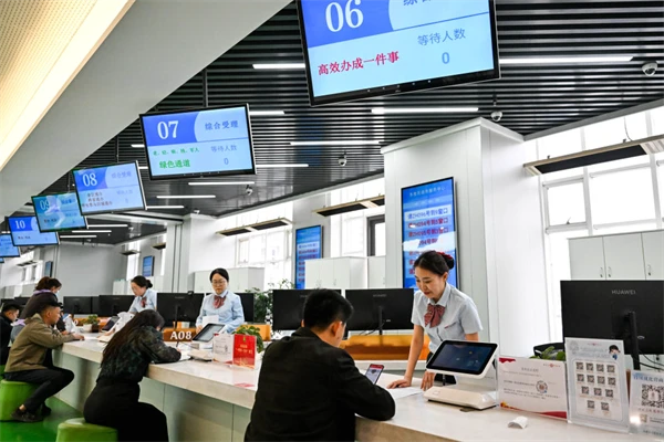 2025年4月16日,在内蒙古鄂尔多斯市东胜区政务服务中心,工作人员办理民营企业相关业务。李志鹏 摄