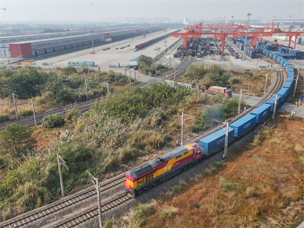 2025年11月28日,X8086次中欧班列从成都青白江区国际铁路港驶出(无人机照片)。王曦 摄