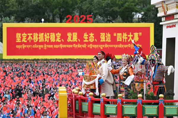 2025年8月21日上午,西藏各族各界干部群众约2万人欢聚拉萨市布达拉宫广场,热烈庆祝西藏自治区成立60周年。这是游行的彩车通过布达拉宫广场。谢环驰 摄