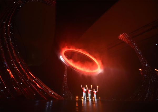 2025年11月9日,第十五届全国运动会开幕式在广东奥林匹克体育中心举行。这是火炬手苏炳添(中)、张家朗(左)、李祎点燃主火炬后向观众致意。肖艺九 摄