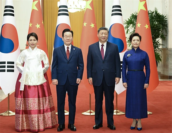 会谈前,习近平和夫人彭丽媛在人民大会堂北大厅为李在明和夫人金惠景举行欢迎仪式。