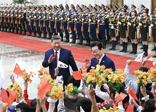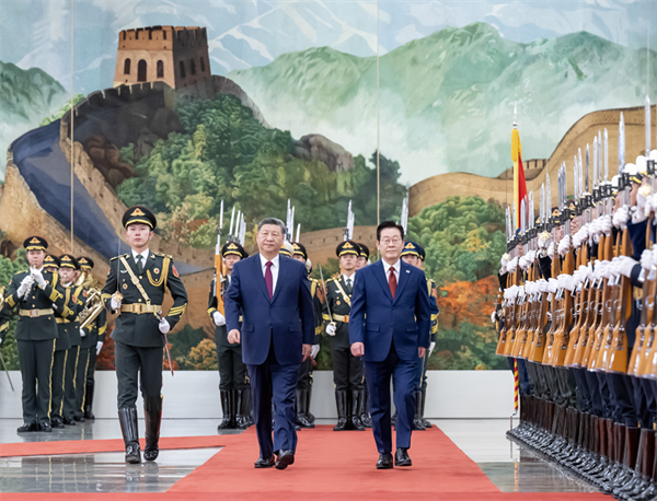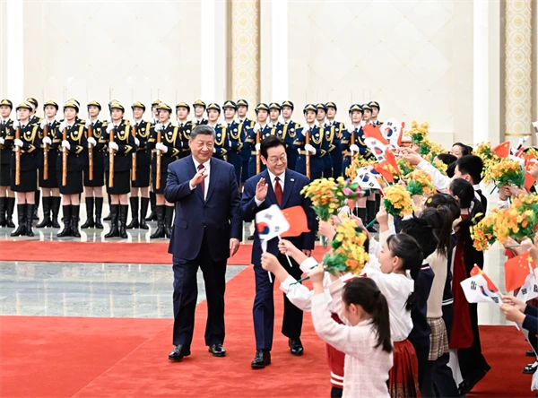 1月5日下午,国家主席习近平在北京人民大会堂同来华进行国事访问的韩国总统李在明举行会谈。这是会谈前,习近平在人民大会堂北大厅为李在明举行欢迎仪式。谢环驰 摄
