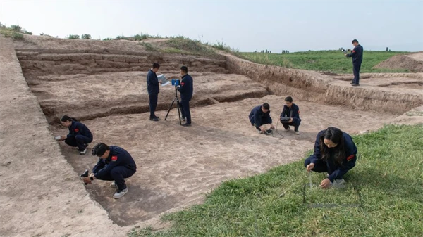 2025年4月30日,敦煌研究院文物工作者在吉尔吉斯斯坦阿克·贝希姆(碎叶城)遗址开展现场?;た辈?。金良 摄