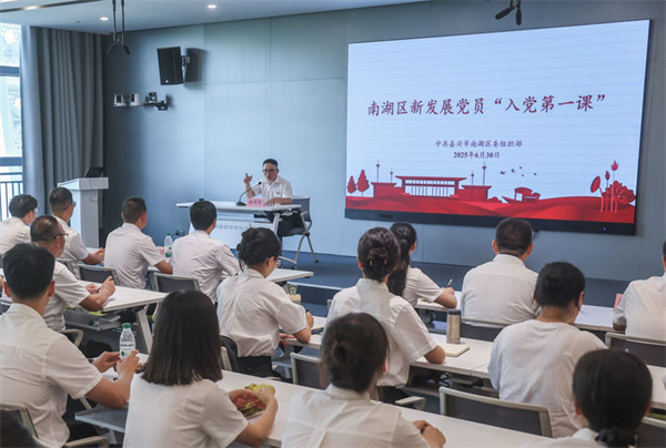 2025年6月30日,浙江嘉兴市南湖区新发展党员在嘉兴市党群服务中心南湖·初心讲堂上进行“入党第一课”学习。新华社记者 徐昱 摄