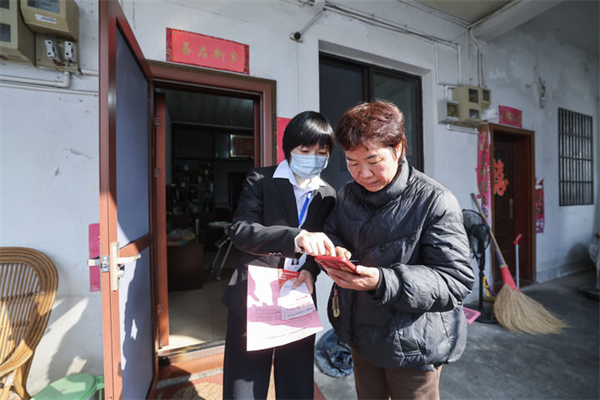 2025年12月18日,浙江省诸暨市东白湖镇事业综合服务中心的党员志愿者(左)上门“一对一”指导村民使用“浙里办”数字化平台办理业务。新华社记者 徐昱 摄