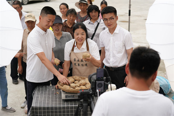2025年6月24日,在陕西省安康市岚皋县孟石岭镇电商直播基地,村干部与电商主播一起直播,帮助当地群众销售农特产品。新华社记者 邵瑞 摄