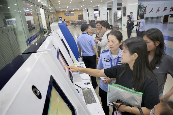 2025年6月25日,工作人员在江苏南通市政务中心出入境办证大厅指导市民使用自助填表系统。许丛军 摄