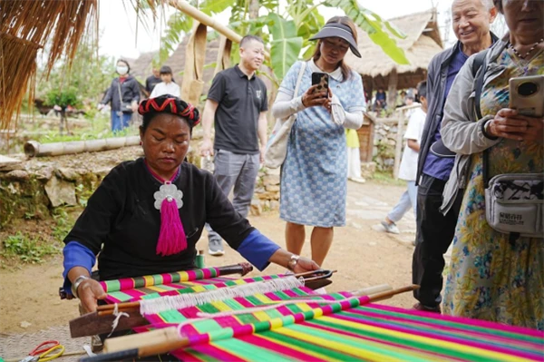 游客在翁丁古寨观看佤族织锦技艺展示。中新社记者刘冉阳 摄