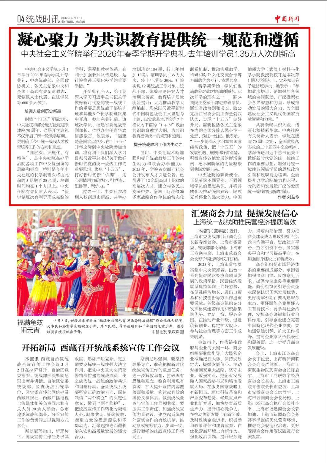 共襄凝聚共识大业,谱写七秩精彩华章。中央社院有关负责人表示,学院在建院70周年之际,全面贯彻落实党的二十届四中全会精神,学深悟透习近平总书记关于做好新时代党的统一战线工作的重要思想,加强对统一战线各领域学员的思想政治引领和履职能力培训,全面提升办学治院能力和水平,为巩固和发展最广泛的爱国统一战线作出新的贡献。